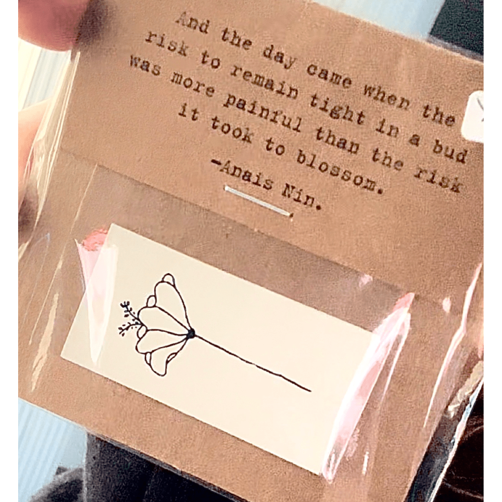 A minimalist sketch of a flower attached to a small brown piece of construction paper with a quote on it by Anais Nin that reads